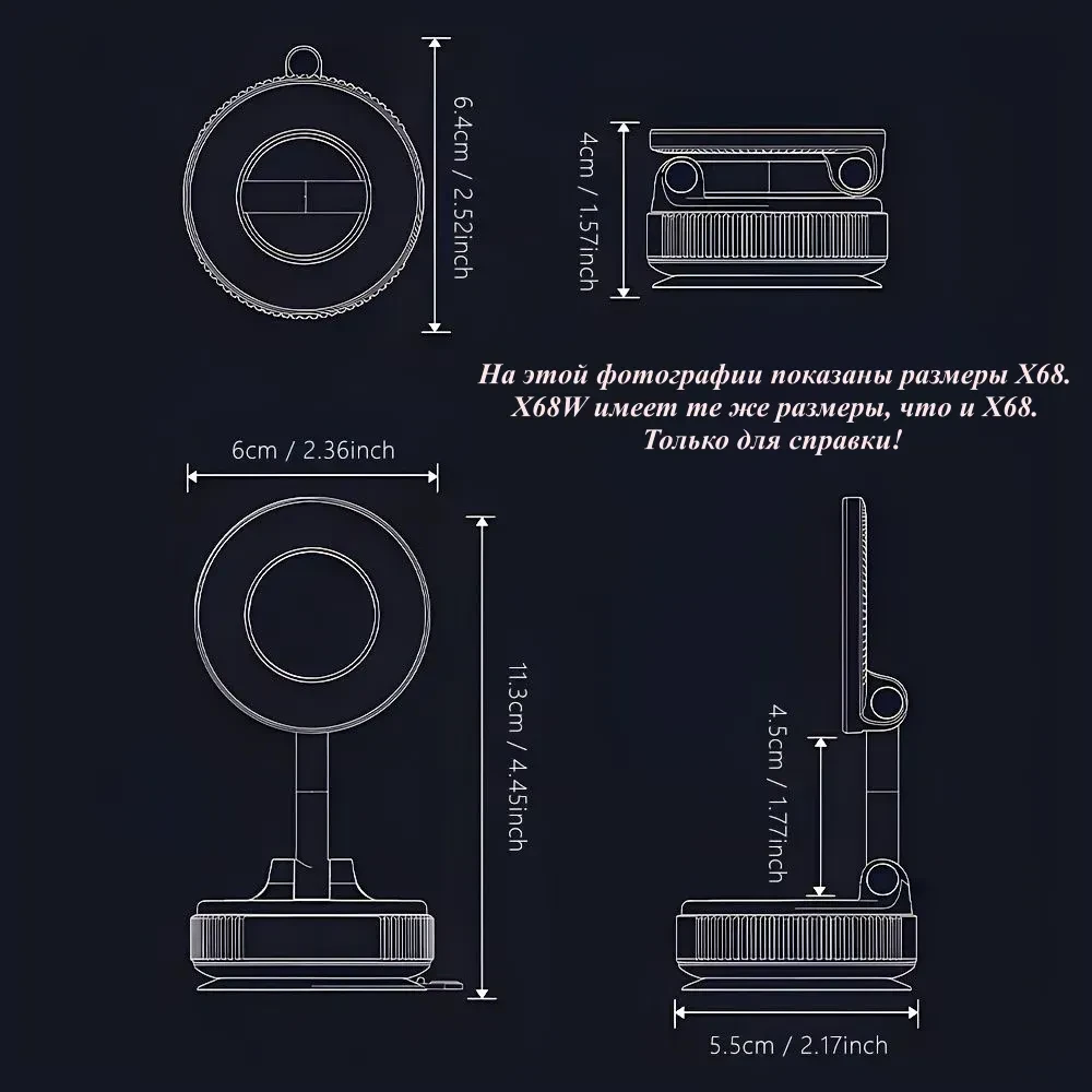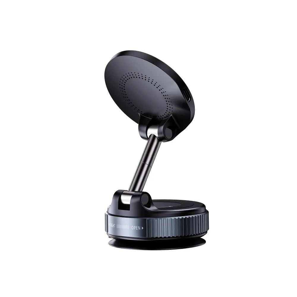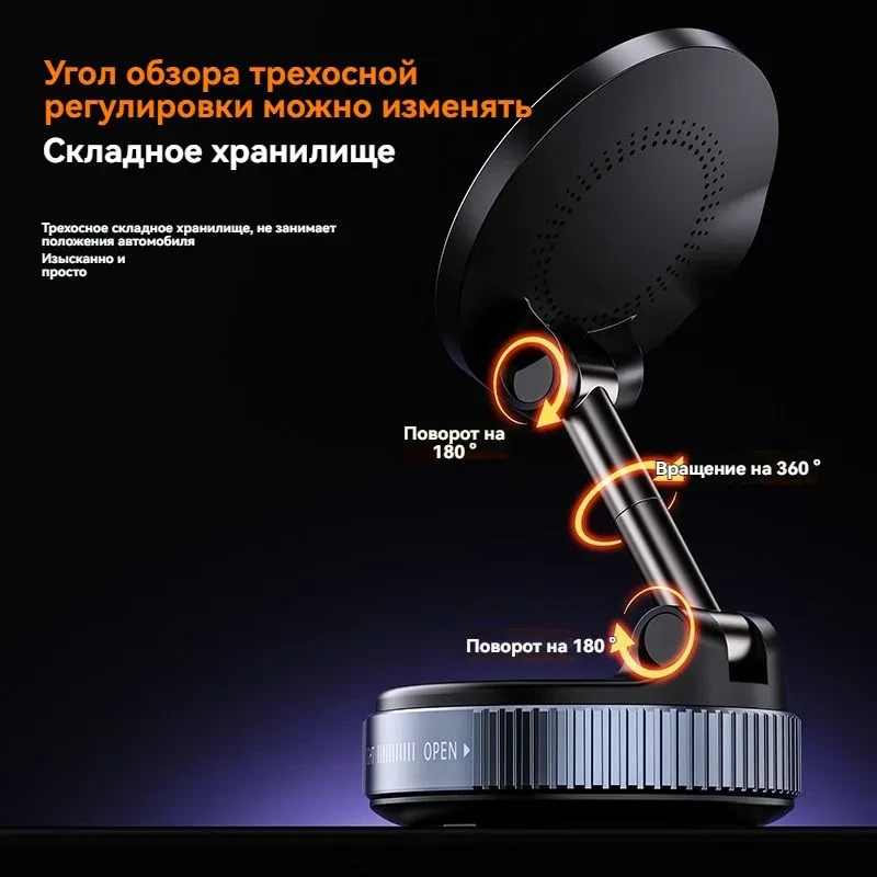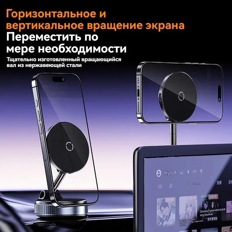Этот держатель для телефона изготовлен из высокопрочного алюминиевого сплава и полностью чёрного цвета. Контактная поверхность телефона имеет двухслойную конструкцию с сильным магнитом, обеспечивающую надёжное крепление и предотвращающую соскальзывание во время использования. Для контакта с автомобильными окнами, приборными панелями или другими гладкими поверхностями используется метод электрической вакуумной адсорбции. Достаточно лёгкого нажатия, чтобы он автоматически закрепился; присасывание сильное, не оставляет следов, прост и надёжен в использовании. Если уровень вакуума на контактной поверхности недостаточен, держатель автоматически определит это и выпустит воздух, чтобы усилить присасывание и обеспечить надёжную работу.