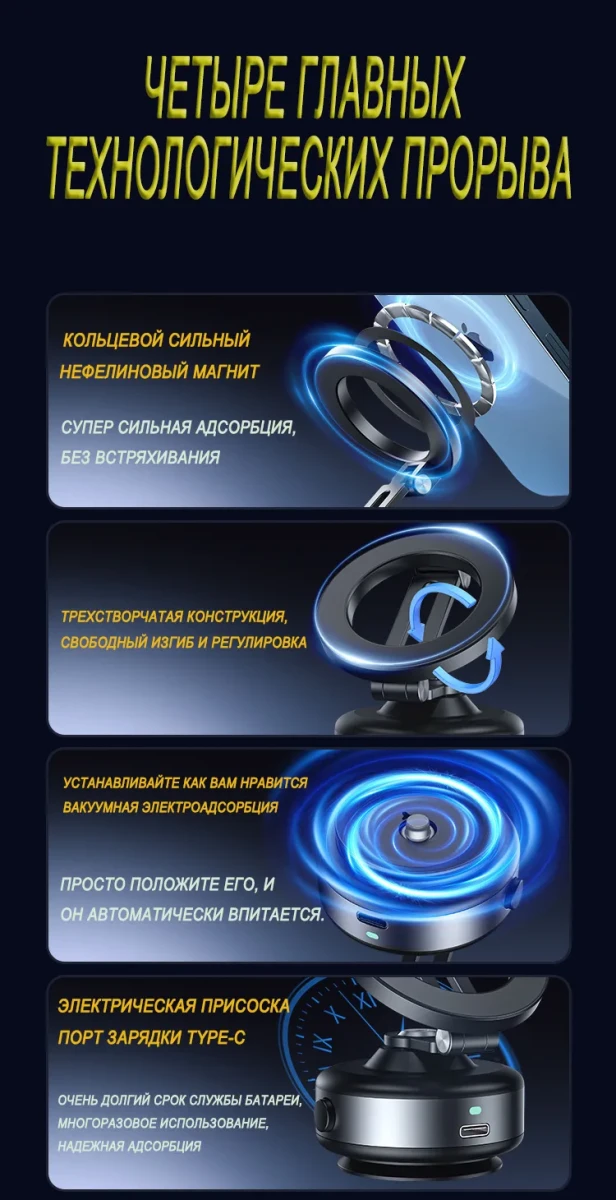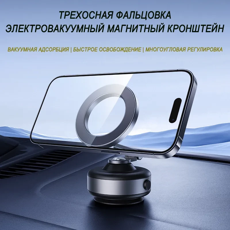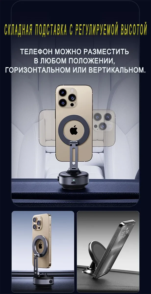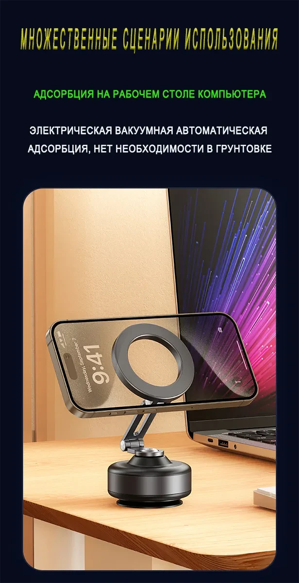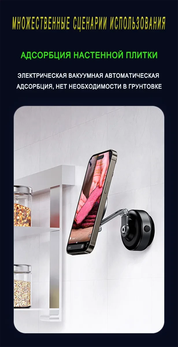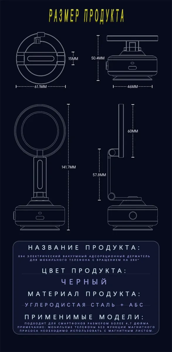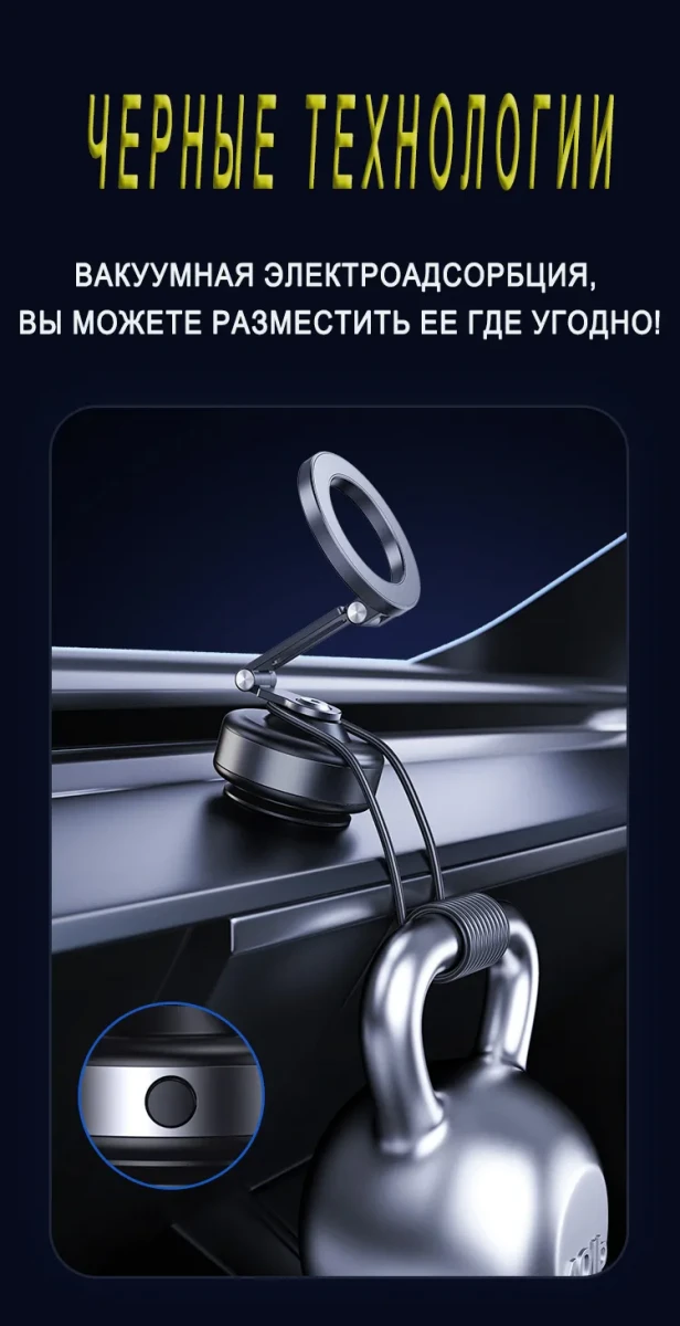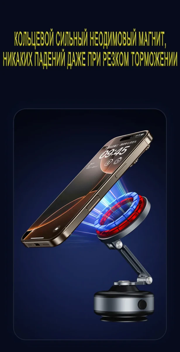 Этот держатель для телефона изготовлен из высокопрочного алюминиевого сплава и полностью чёрного цвета. Контактная поверхность телефона имеет двухслойную конструкцию с сильным магнитом, обеспечивающую надёжное крепление и предотвращающую соскальзывание во время использования. Для контакта с автомобильными окнами, приборными панелями или другими гладкими поверхностями используется метод электрической вакуумной адсорбции. Достаточно лёгкого нажатия, чтобы он автоматически закрепился; присасывание сильное, не оставляет следов, прост и надёжен в использовании. Если уровень вакуума на контактной поверхности недостаточен, держатель автоматически определит это и выпустит воздух, чтобы усилить присасывание и обеспечить надёжную работу.