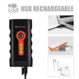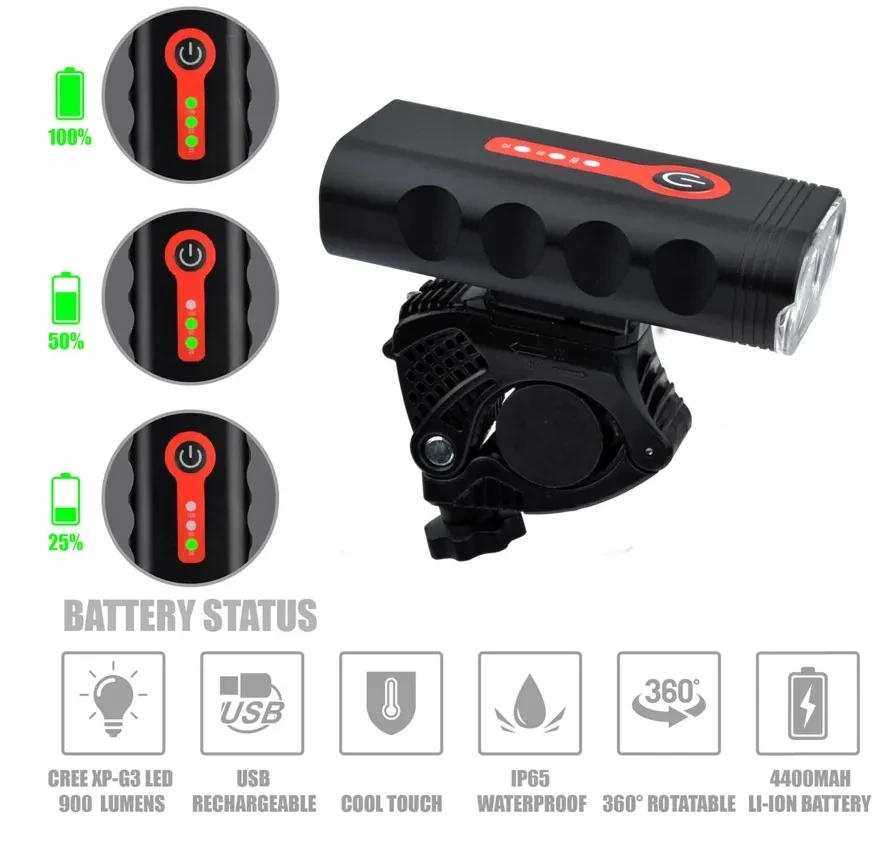 | Время работы: | Время зарядки: 5-7 часов в зависимости от USB-зарядного устройства Режимы и время работы: 20% (13 ч) - 50% (5 ч) - 100% (2,5 ч) - быстрое мигание (10 ч) - медленное мигание (8 ч) (на основе 2*2200 мАч аккумуляторов) | Особенности: | Нажмите кнопку для включения и смены режимов Двойное нажатие кнопки для переключения между постоянным и импульсным режимами Нажмите и удерживайте кнопку в течение 1 секунды = ВЫКЛ Основные материалы: Пластик + алюминиевая оправа |