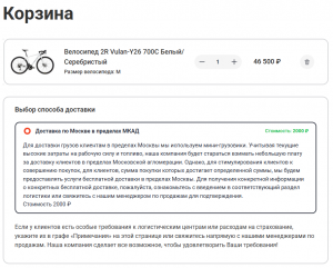 - Для тех, чей пункт получения находится в пределах Московской области, если количество приобретаемых вами велосипедов составляет три и более, или общая сумма приобретенных товаров составляет 100 000 рублей и более, наша компания доставит вам их бесплатно. Если количество приобретенных вами велосипедов или общее количество товара будет меньше указанного стандарта, мы взимаем соответствующую плату (2000 рублей за доставку). Надеемся на ваше понимание.