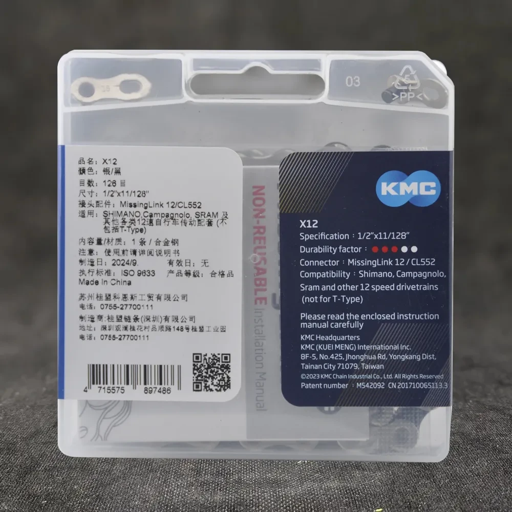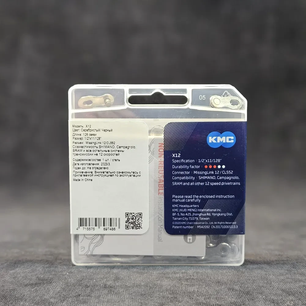 Цепь велосипедная KMC X12 Silver-Black, 12 скоростей, 126 звеньев, с замочком MissingLink 12R/CL552R в комплекте