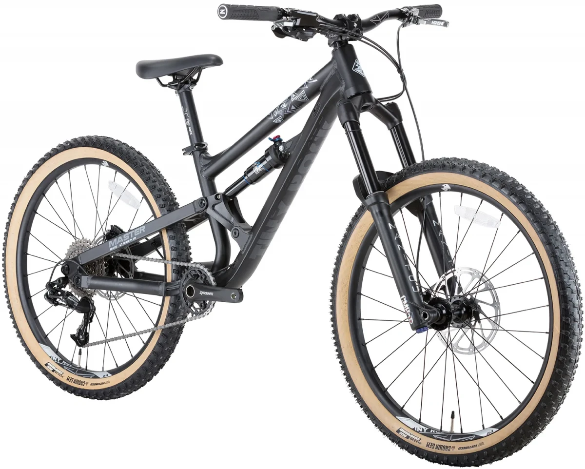 Старший двухподвес Tiny Rock в алюминиевом исполнении — для подростков, которые катают серьёзно, но без переплаты за карбон. Tiny Rock MASTER 24" построен на алюминиевой раме и сохраняет ту же геометрию и подвеску, что и карбоновая MASTER S. Воздушная вилка Manitou Air Fork и задний амортизатор X-Fusion O2 Pro RL выдают по 140 мм хода — этого достаточно для полноценных трейлов и каменистых сбросов.